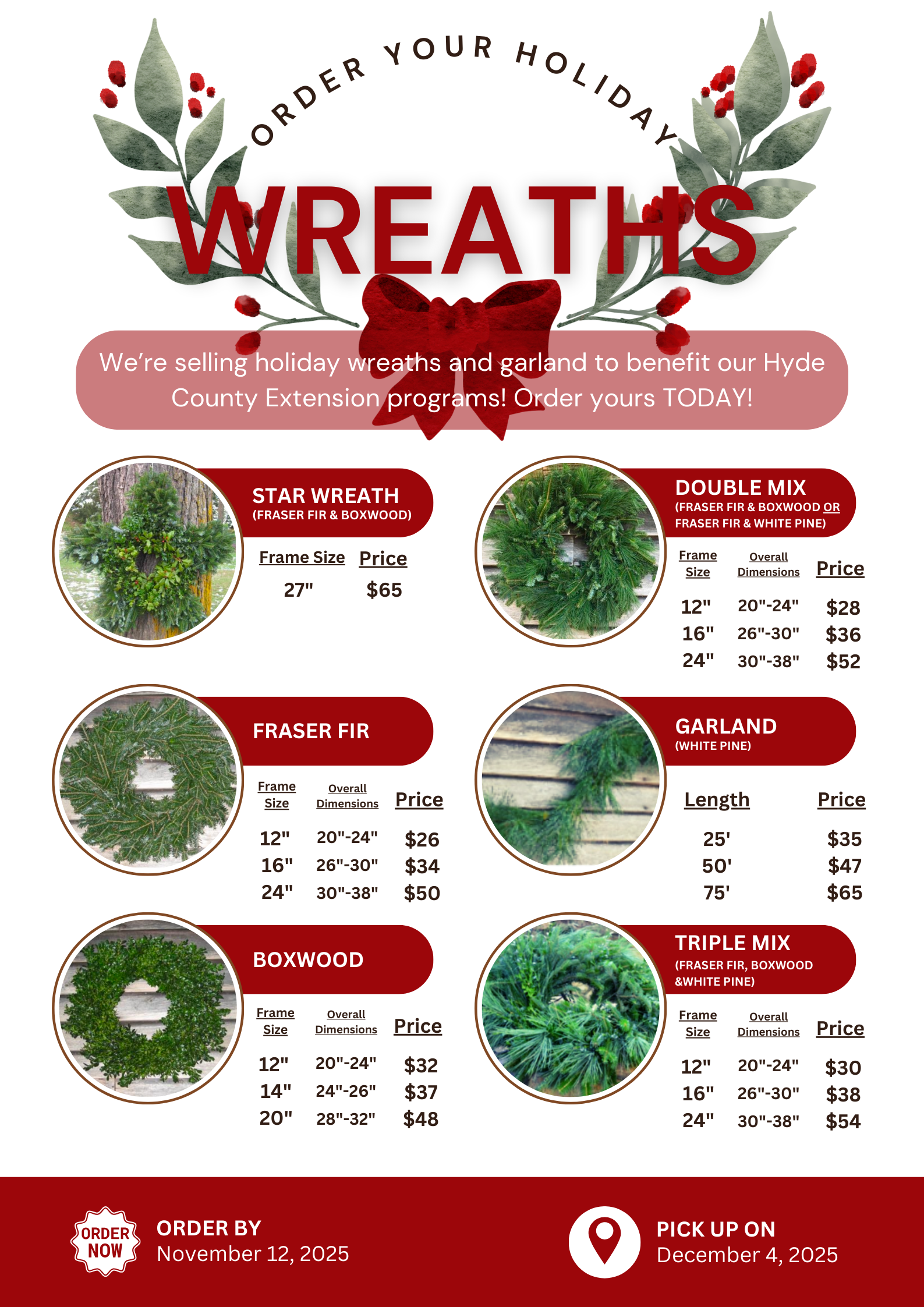 All orders must be received by Wednesday, November 12, 2025. Items can be picked up starting Thursday, December 4th at the N.C. Cooperative Extension, Hyde County Center from 8:30 a.m.-4:30 p.m..
